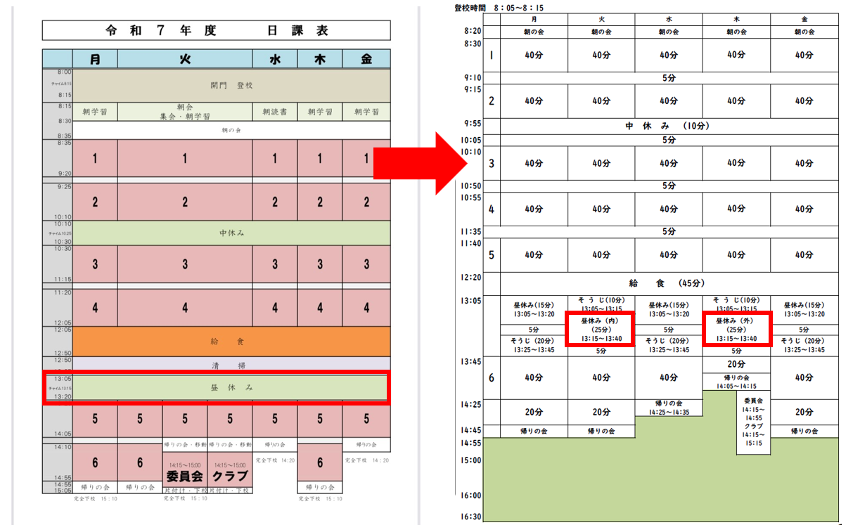 左が一般的な45分の授業の時間割で、昼休みは15分になっています。