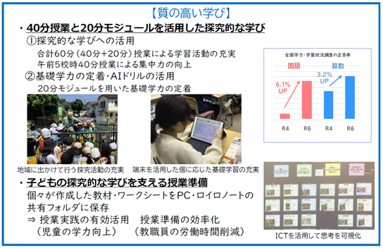 この削った5分の時間をまとめて、20分のモジュール時間とし、40分授業と合わせた60分の時間を探究的な学びに活用したり、児童の実態に応じた基礎学力の定着の時間に充てることができます。