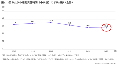 スポーツ財団の研究では、小学生以下のこどもたちの1日あたりの運動・外遊び時間は、過去10年間で減少傾向にあり、2023年には全体の中央値として28.3分と、過去最低を記録しています。