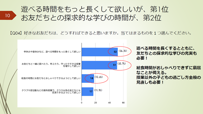また、「好きな友達はどうすればできると思うか」との質問には、「中休みや昼休みなど、遊べる時間をもっと長くしてほしい」、「お友だちと一緒に調べたり、考えたり、作ったりできる授業(探求的な学び)を増やして欲しい」、という回答が上位でした。